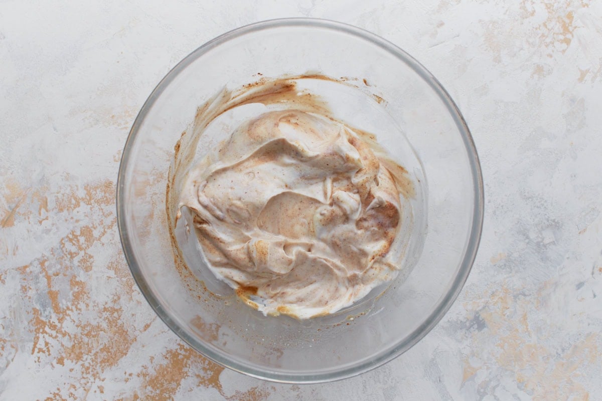 Combine the ingredients: In a medium bowl, add 1 cup (240g) full-fat dairy-free yogurt, 1 tbsp (14g) nut butter, 1 tbsp (15ml) maple syrup, ½ tsp pure vanilla extract, ¼ tsp cinnamon, and a pinch of salt.