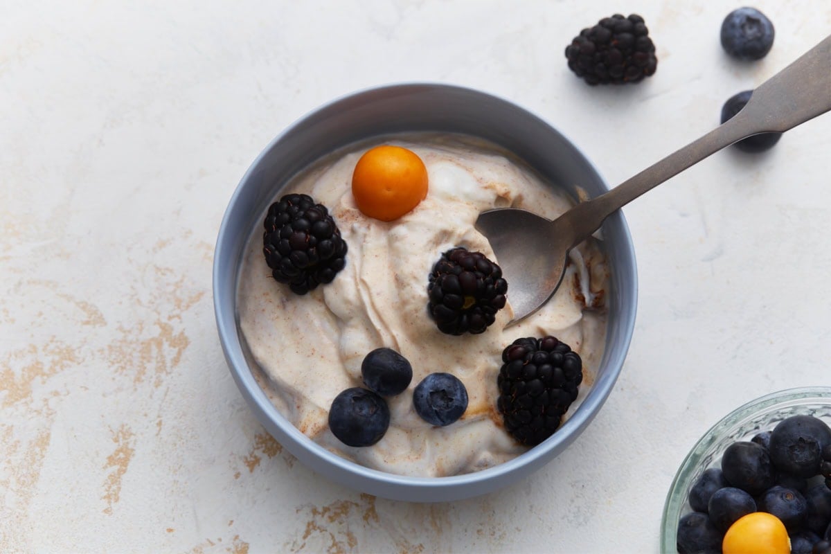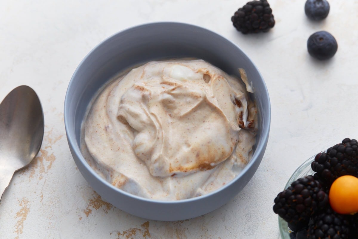 - In a medium bowl, whisk together dairy-free yogurt, nut butter, maple syrup, vanilla, cinnamon, and salt, until combined. Taste and adjust sweetness if needed.