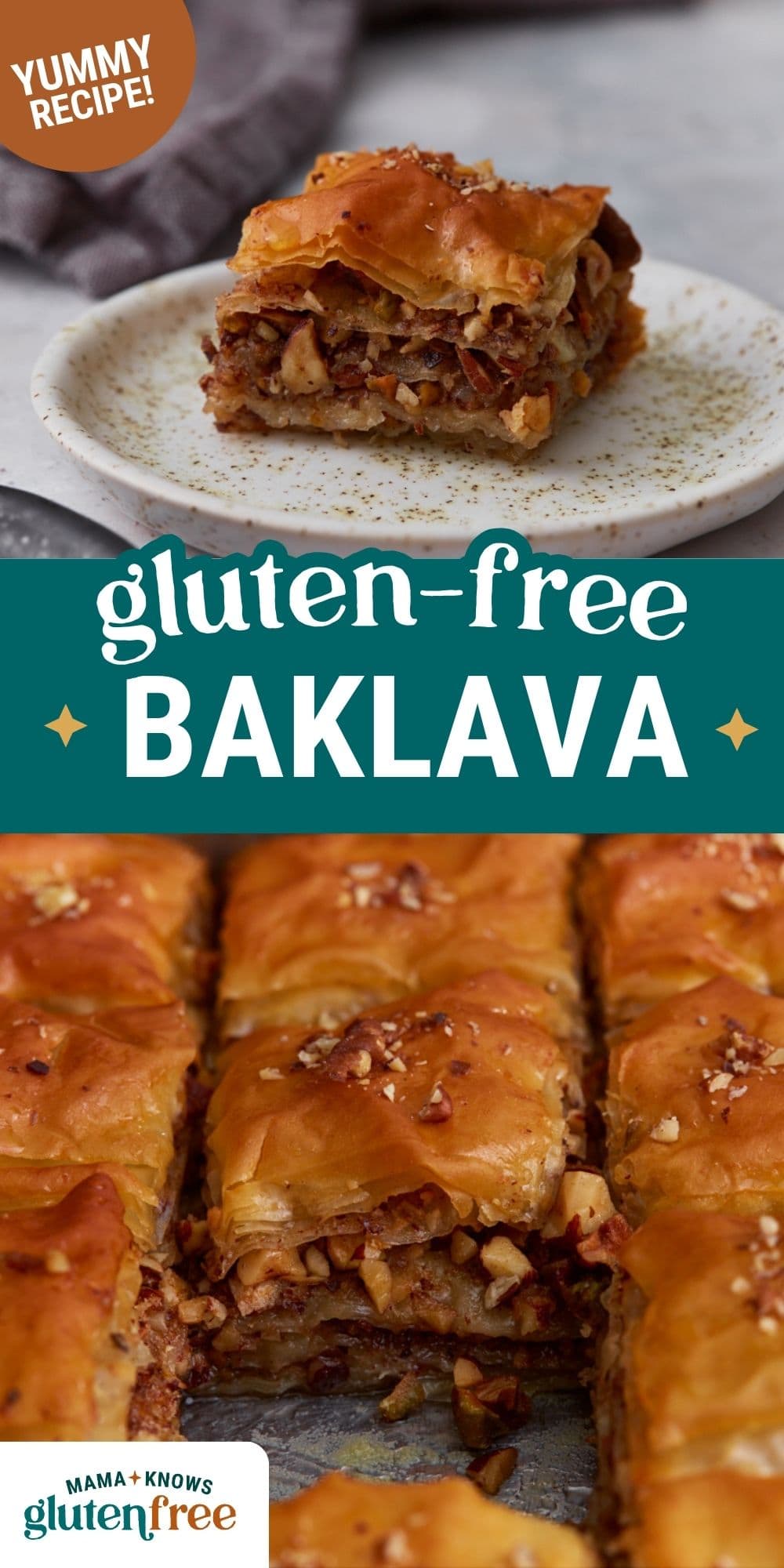 Gluten-free baklava is a flaky layered pastry made with gluten-free phyllo dough, spiced chopped nuts, and a sweet honey syrup. This classic Mediterranean dessert bakes into crisp buttery layers with a rich nut filling and fragrant syrup that soaks into every bite. It’s a naturally egg-free dessert that’s perfect for holidays, dinner parties, or anytime you want a homemade gluten-free treat.