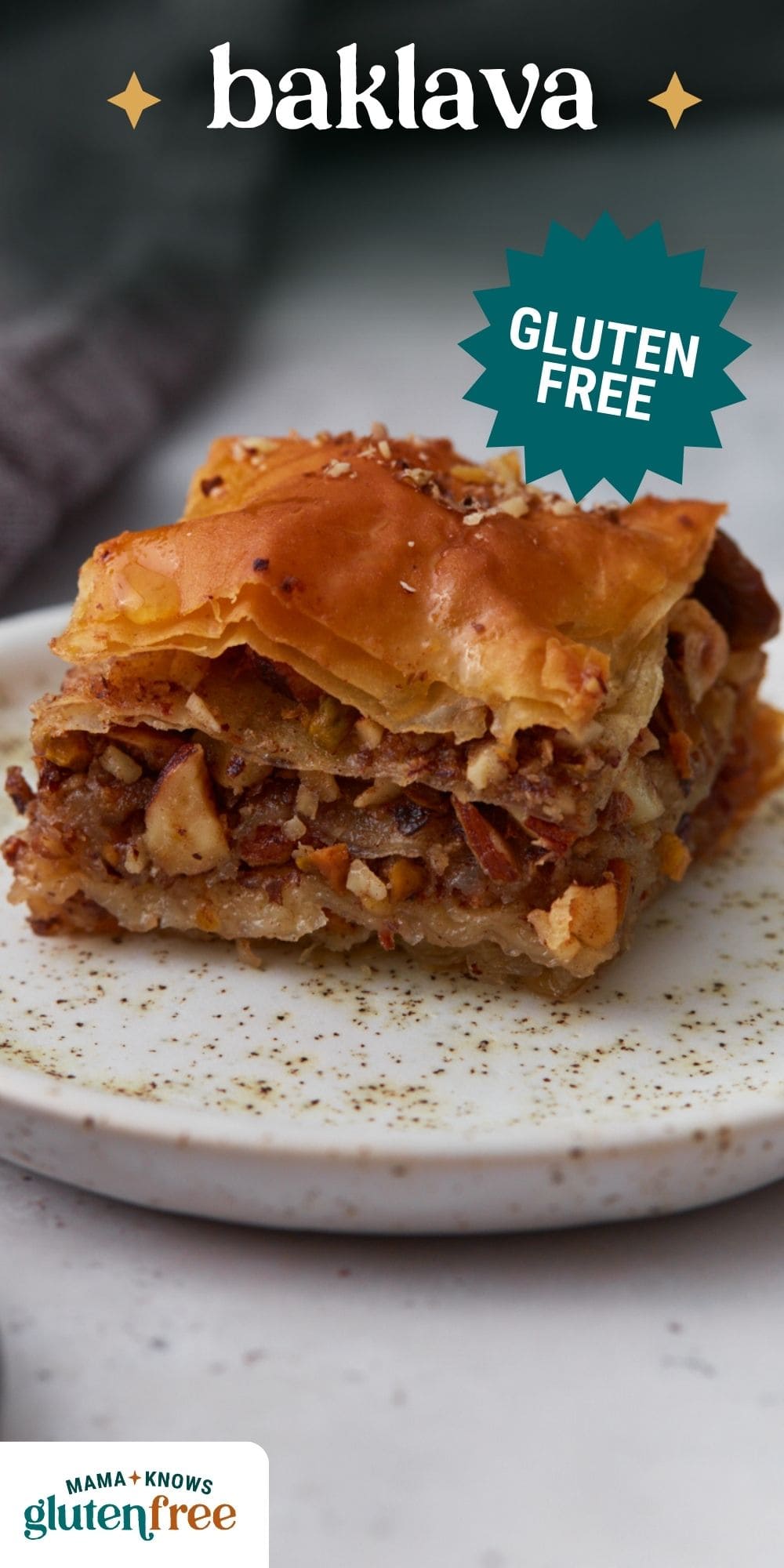 Baklava has always been one of those desserts that feels a little magical to me. All those delicate layers of phyllo, the spiced nuts, and the honey syrup soaking into every bite. It’s simple ingredients, but the technique makes it special. For this gluten-free baklava, I used my gluten-free phyllo dough, but store-bought can be used as well. I layered the phyllo with finely chopped nuts, cinnamon, and plenty of melted butter. As it bakes, the layers turn golden and crisp, and then the hot pastry gets soaked with a fragrant honey syrup flavored with cloves and lemon peel. Baklava has deep roots across the Mediterranean and Middle East, and while every region has its own variation, the idea is always the same. They’re a sweet little bite to enjoy with coffee or tea in the afternoon or as an Easter dessert or after-dinner treat.