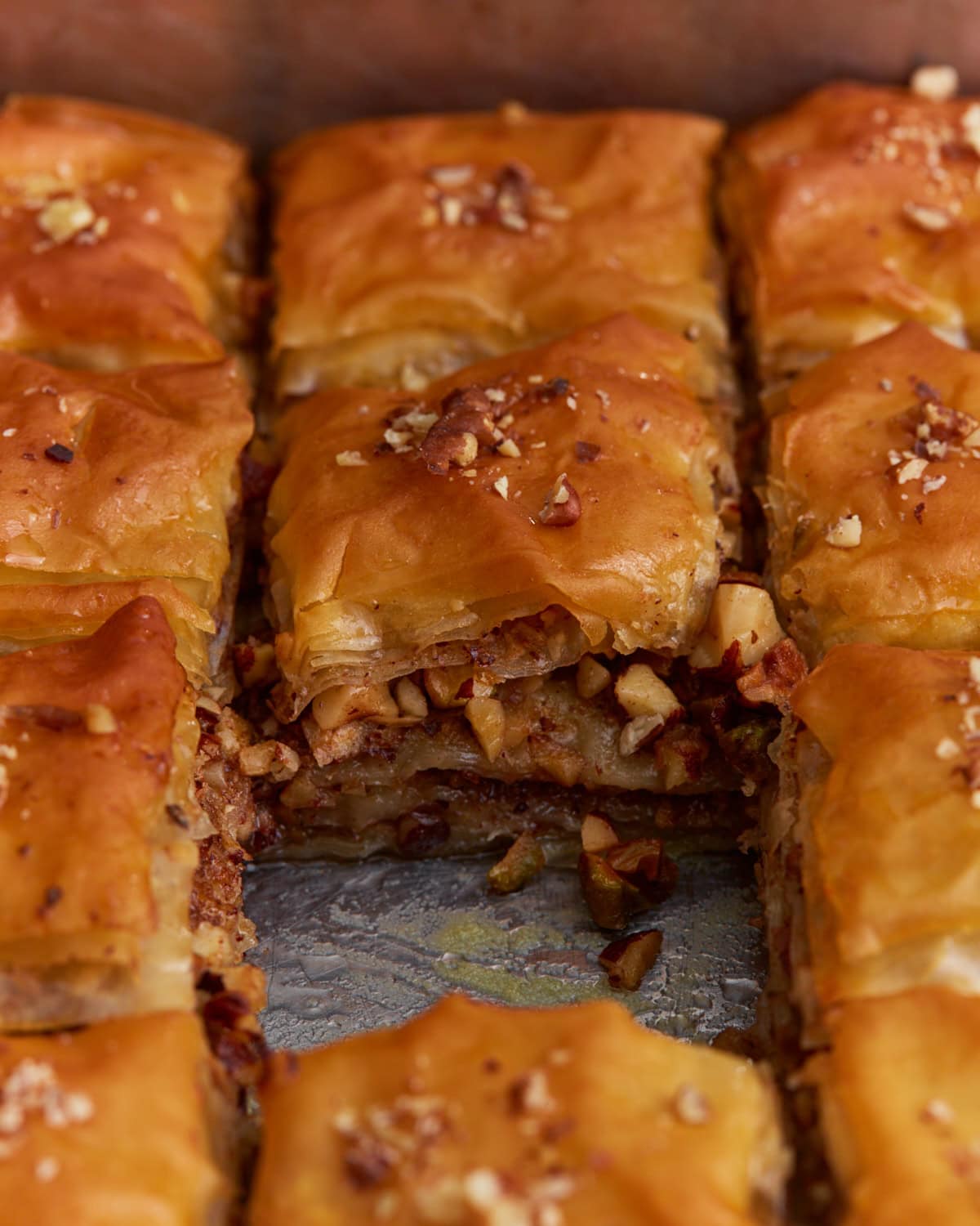 - Repeat with 6 more phyllo sheets, butter, and remaining nuts.