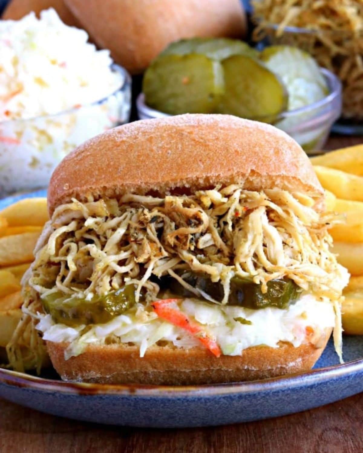 I like to make my sandwiches Southern style with coleslaw, and bread and butter pickles. The creamy coleslaw and crunchy pickles complement the savory seasoning of the shredded chicken. (My kids like them plain). Before I chow down on the sandwich, I start with a crisp and tart Greek quinoa salad and finish off the meal with these tender and crisp beignets.