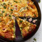 This crustless ham and cheese quiche is an easy, gluten-free breakfast or brunch that comes together with simple, everyday ingredients you likely already have on hand. Eggs, cream, savory ham, sautéed onion, and melty Swiss or cheddar cheese are layered into a pie dish and baked until just set and lightly golden.
